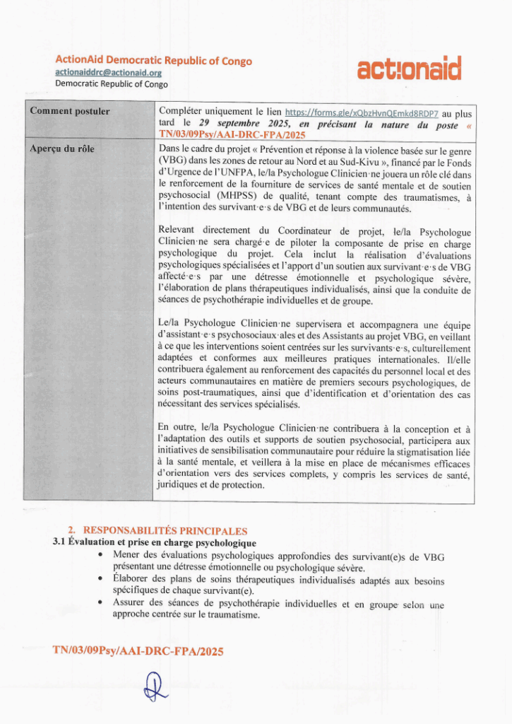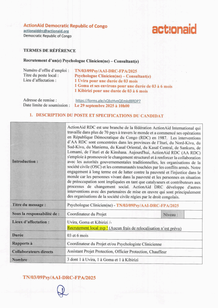 Intitulé du poste Psychologue Clinicien (ne) – Consultant (e) Références TN/03/09Psy/AAI-DRC-FPA/2025 Date de publication 17 septembre 2025 Date de limite 29 septembre 2025 Lieu d’affectation U...