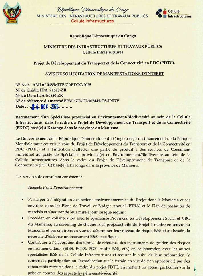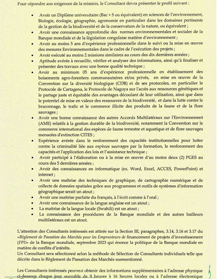 | Intitulé du poste | SPECIALISTE PROVINCIAL EN ENVIRONNEMENT / BIODIVERSITE | |