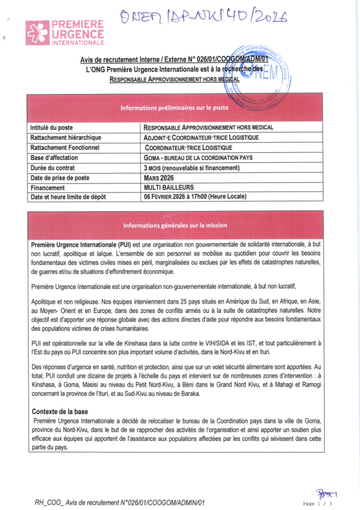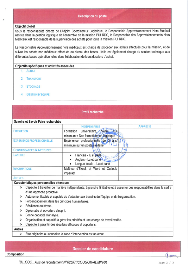 NUMERO DE REFERENCE : 026/01/COOGON/ADM/01Responsable Approvisionnement Hors Médical