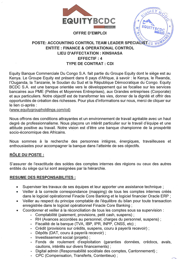 | Intitulé du poste | ACCOUNTING CONTROL TEAM LEADER SPECIALIST | |
