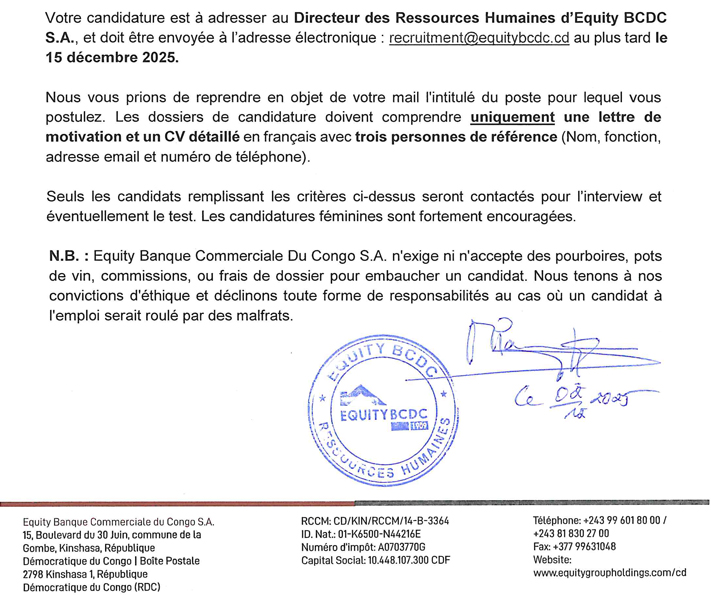 | l’adresse email pour postuler | recrutement@equitybcdc.cd |
