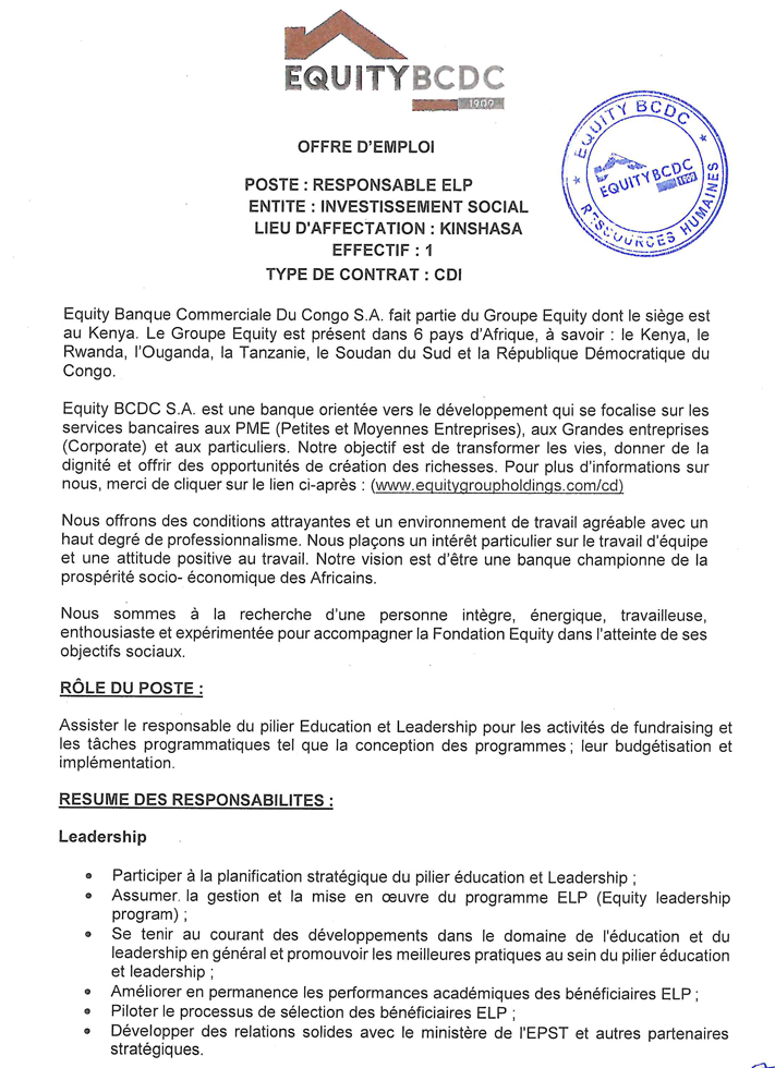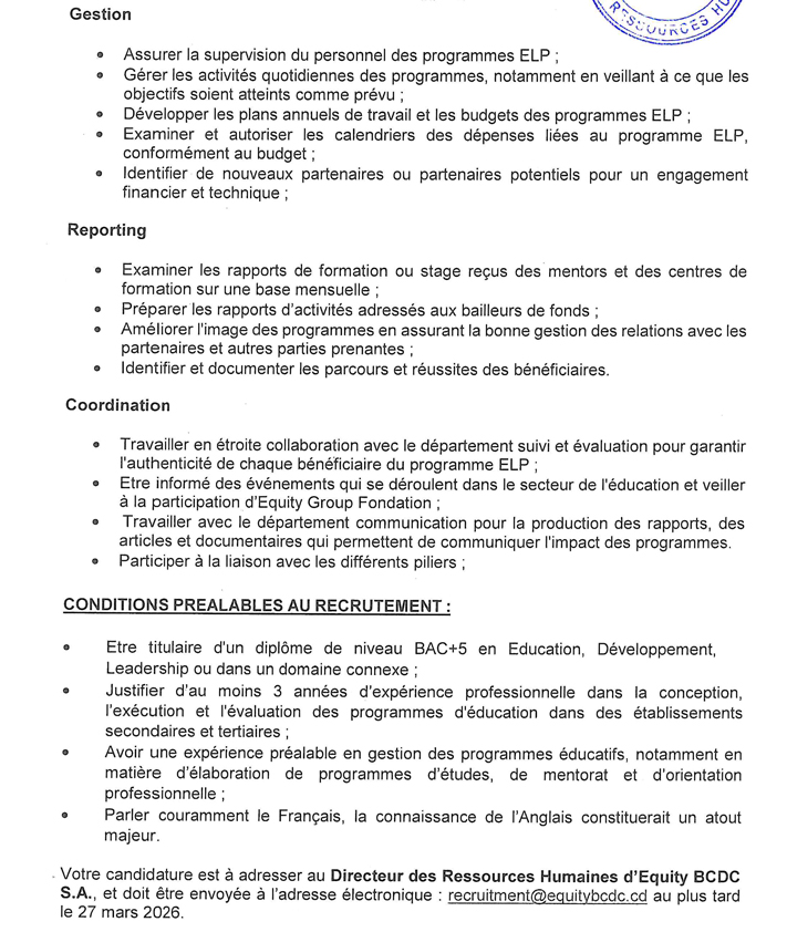 | l’adresse email pour postuler | recruitment@equitybcdc.cd |