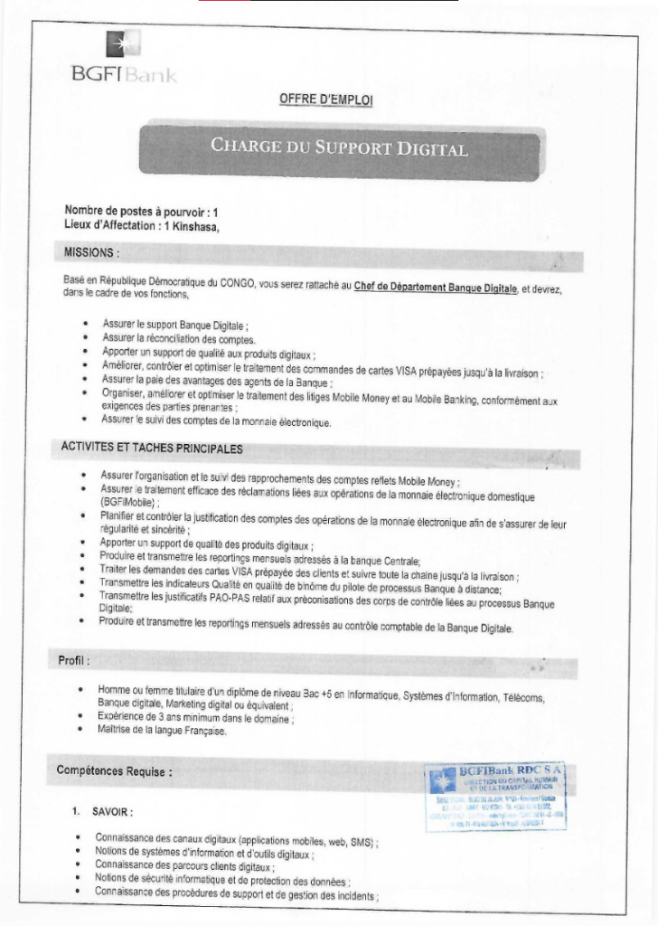 | Adresse email pour soumissionner | recrutement.bgfibankrdc@bgfi.com |