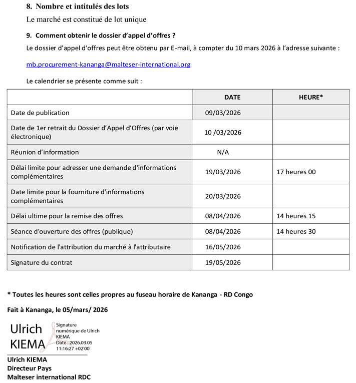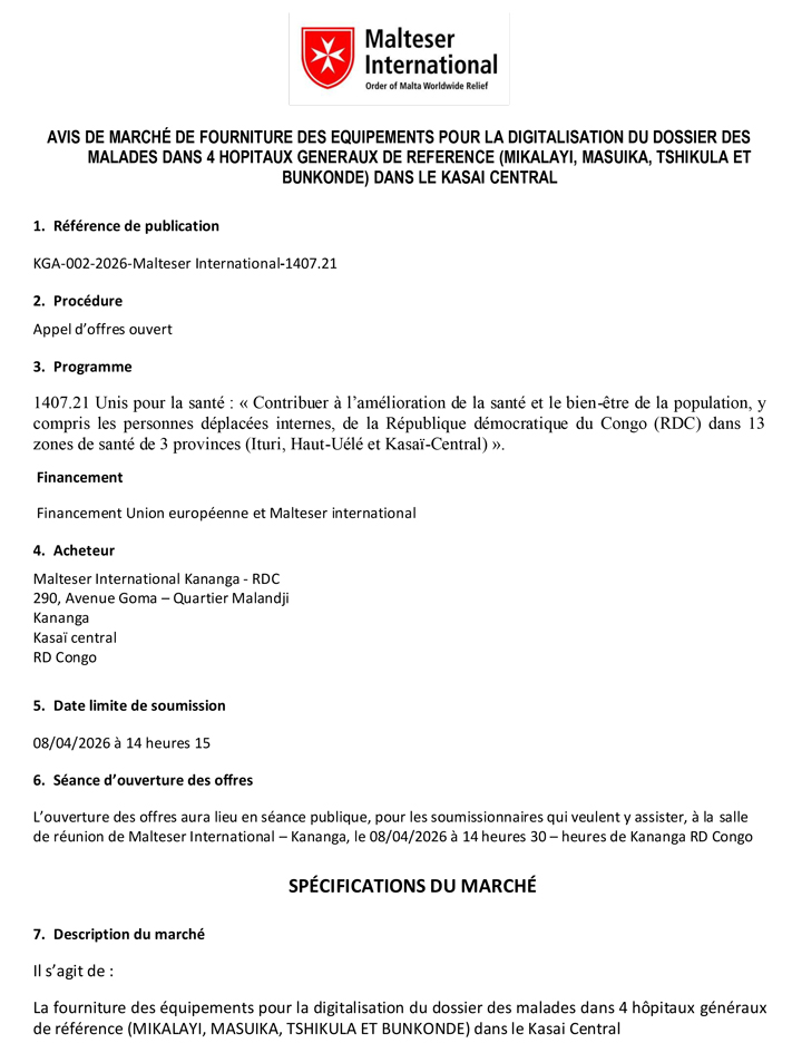 | Adresse e-mail pour soumissionner | Mb.procurement-kananga@malteser-international.org |