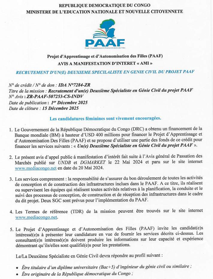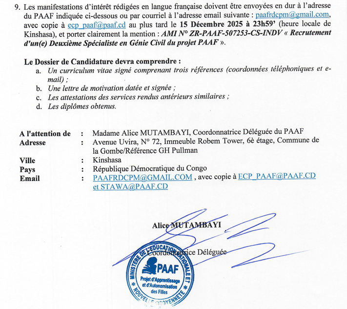 | l’adresse email pour postuler | paafrdcpm@gmail.com ccp_paaf@paaf.cd |