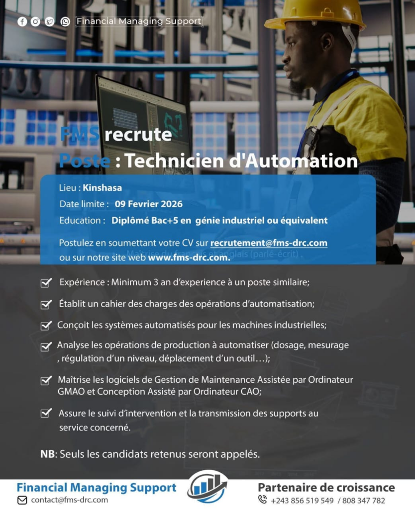 | Intitulé du poste | TECHNICIEN D'AUTOMATION |