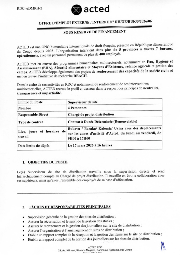 Intitulé du poste Superviseur de site Références RH/OE/BUK/3/2026/06 Date de publication 10 mars 2026 Date de limite 17 mars 2026 Lieu d’affectation Bukavu, Kalemie, Baraka, Uvira Organisme ou so...