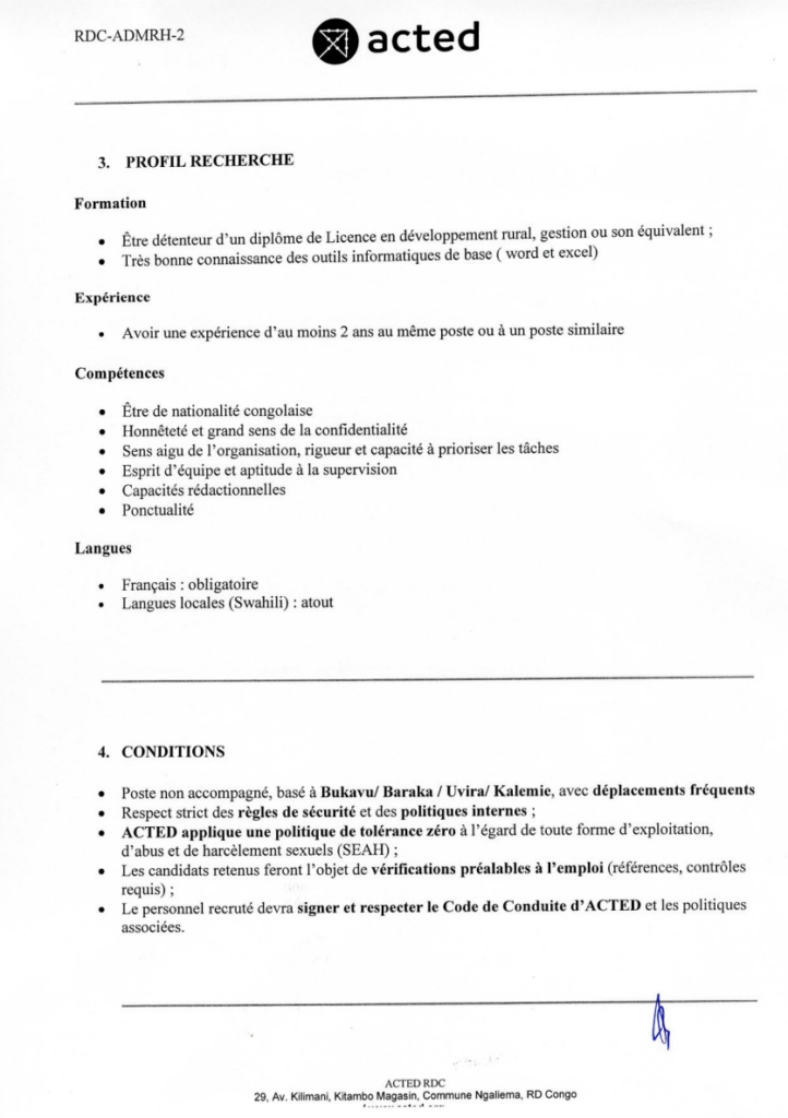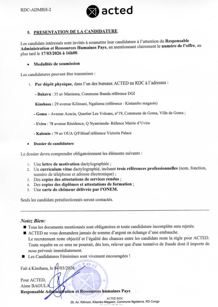 | Adresse email pour soumissionner | kinshasa@acted.org |
