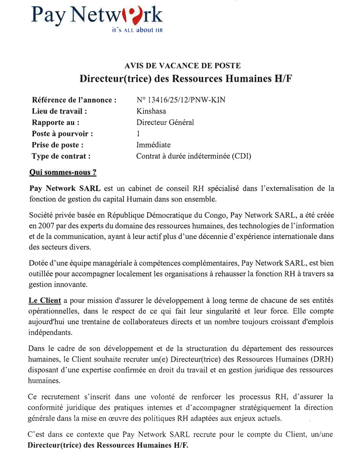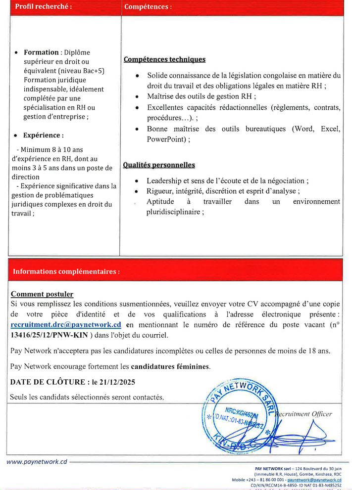 | l’adresse email pour postuler | Recruitment.drc@paynetwork.cd |